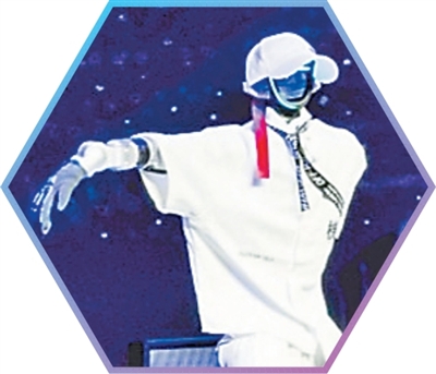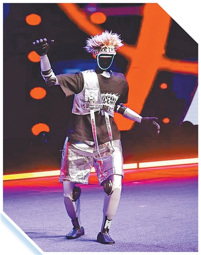 在首届国际人形机器人街舞邀请赛上,机器人穿着潮流服饰表演街舞。刘 峥摄