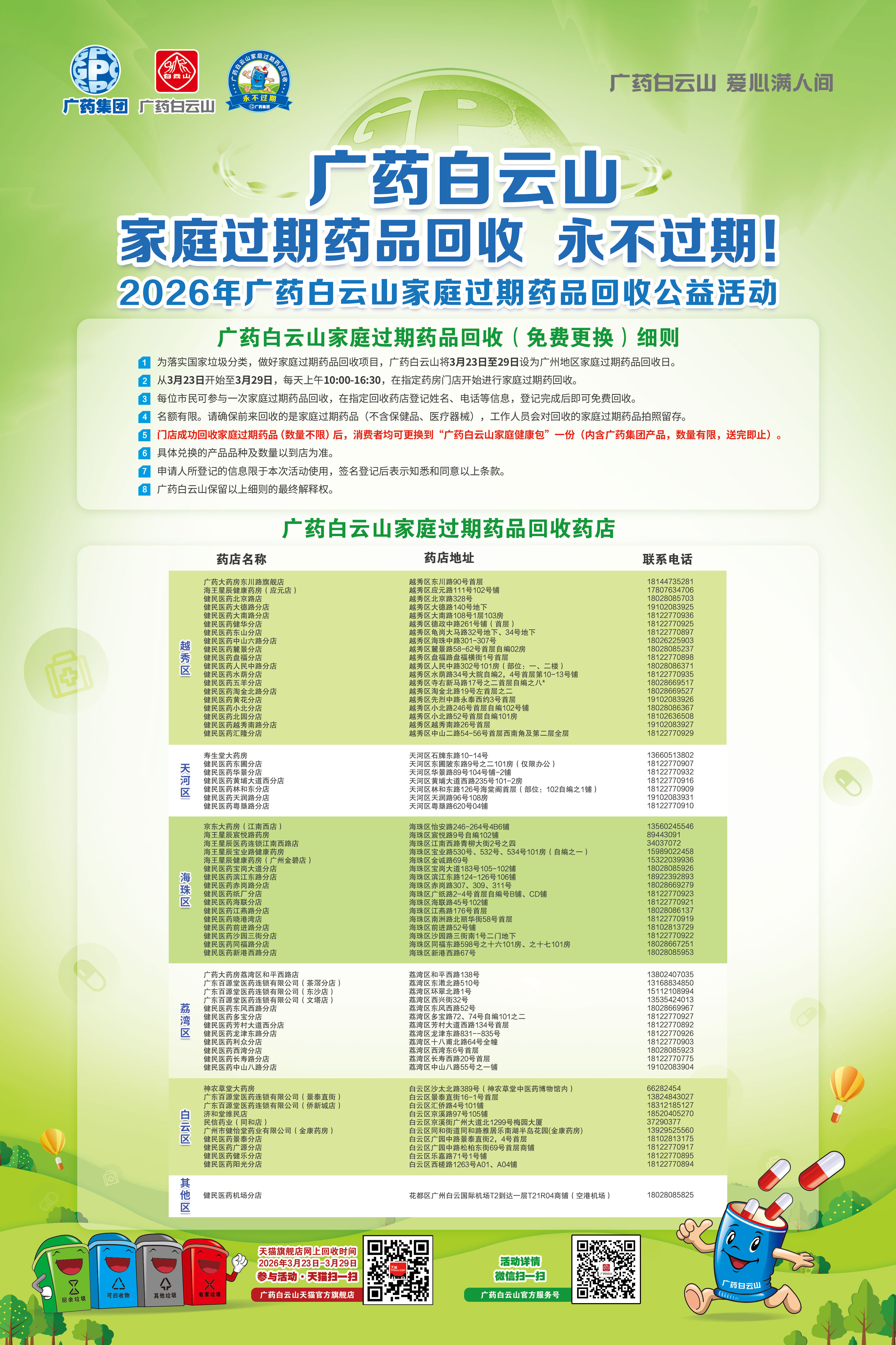 你家药箱里是不是也囤着几盒过期药?扔了怕污染环境,留着又占地方。3月23日至29日,2026年广药白云山“家庭过期药品回收”公益活动启动,广州65家指定药房门店化身“回收站”,市民带上过期药品前往,就能换回一份实用的“家庭健康包”。